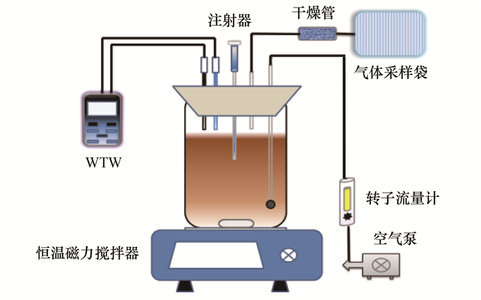 本試驗(yàn)裝置如圖 1所示, 反應(yīng)器內(nèi)裝有從穩(wěn)定運(yùn)行短程SBR反應(yīng)器內(nèi)取出的活性污泥, 外加試驗(yàn)所需的模擬廢水, 頂部用橡膠塞密封, 并開有5個(gè)直徑不同的小孔, 分別為DO和pH探頭孔及曝氣、取水樣、集氣孔.反應(yīng)器總體積1 L, 有效容積0.7 L.反應(yīng)器置于恒溫磁力攪拌器上, 維持池體內(nèi)溫度為25℃, 并用磁力轉(zhuǎn)子攪拌, 使池體內(nèi)處于混勻狀態(tài).