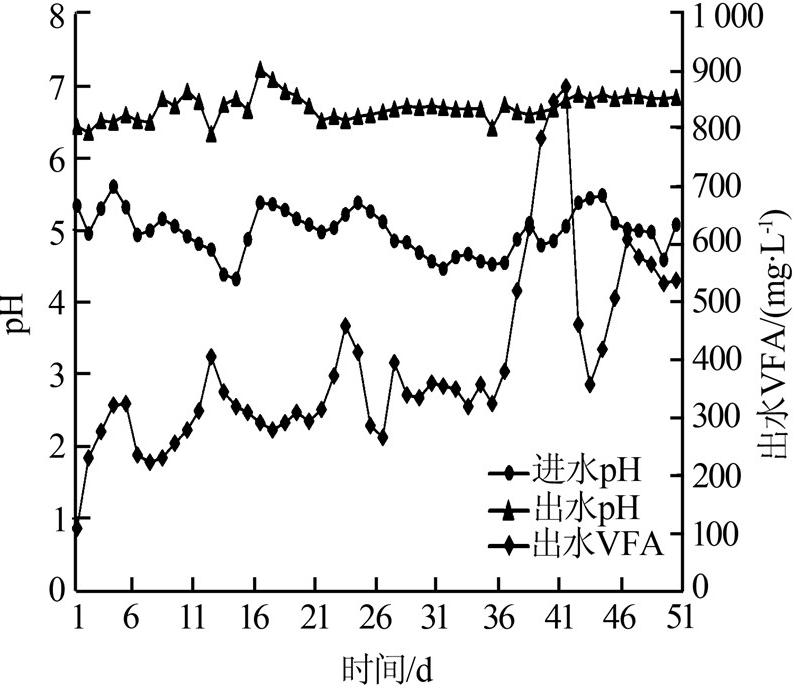 由圖 4可見,反應(yīng)器進(jìn)水pH介于4.32~5.48,pH較低;反應(yīng)器出水pH介于6.35~7.08。第1天~第20天,反應(yīng)器出水pH變化幅度較大,這是由于微生物經(jīng)歷了由活性較低到基本適應(yīng)新的生存環(huán)境、活性逐步加強(qiáng)的過程,能夠較充分地吸收利用產(chǎn)生的有機(jī)酸;附加循環(huán)系統(tǒng)將第二反應(yīng)室處理水部分回流至反應(yīng)器底部,進(jìn)一步加強(qiáng)反應(yīng)器內(nèi)部攪拌與混合,促進(jìn)有機(jī)物與微生物的接觸,減小低pH進(jìn)水對(duì)反應(yīng)器的沖擊,同時(shí)回流水堿度較高,增強(qiáng)了系統(tǒng)的緩沖能力。第21天~第50天反應(yīng)器出水pH變化幅度較小,較為穩(wěn)定,此時(shí)反應(yīng)器內(nèi)微生物活性較高,產(chǎn)甲烷菌能夠充分利用產(chǎn)生的揮發(fā)性脂肪酸,避免脂肪酸在反應(yīng)器內(nèi)的積累,含氮有機(jī)物經(jīng)脫氨作用將氨氮釋放于水中,在提高出水pH方面起到一定作用,同時(shí)附加循環(huán)系統(tǒng)在一定程度上增強(qiáng)了系統(tǒng)的緩沖能力,使得反應(yīng)器出水pH比較穩(wěn)定。第36天起,由于刷罐水的排放引起較強(qiáng)的沖擊負(fù)荷,進(jìn)水容積負(fù)荷波動(dòng)較大,出水VFA較高,為了防止反應(yīng)器pH下降進(jìn)而抑制產(chǎn)甲烷菌的活性,向反應(yīng)器加入石灰,維持反應(yīng)器內(nèi)部pH>6.5,為產(chǎn)甲烷菌創(chuàng)造良好的生存環(huán)境。由圖 4還可以看出,出水VFA變化明顯比出水pH變化波動(dòng)幅度大,運(yùn)行后期波動(dòng)更加明顯,可見出水VFA變化比pH變化更為靈敏,能夠更好地指示反應(yīng)器的運(yùn)行狀況。