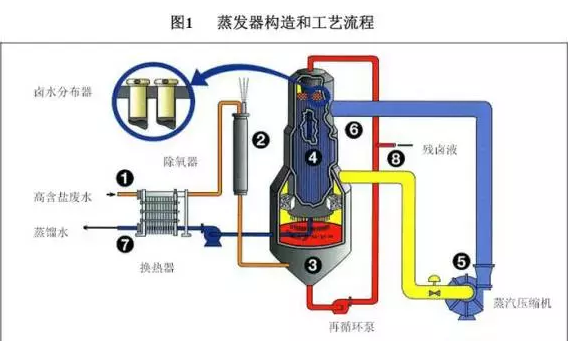 所謂的機械蒸汽再壓縮循環蒸發技術,是根據物理學的原理,等量的物質,從液態轉變為氣態的過程中,需要吸收定量的熱能。當物質再由氣態轉為液態時,會放出等量的熱能。根據這種原理,用這種蒸發器處理廢水時,蒸發廢水所需的熱能,再蒸汽冷凝和冷凝水冷卻時釋放熱能所提供。在運作過程中,沒有潛熱的流失。運作過程中所消耗的,僅是驅動蒸發器內廢水、蒸汽、和冷凝水循環和流動的水泵、蒸汽泵和控制系統所消耗的電能。為了抵抗廢水對蒸發器的腐蝕,保證設備的使用壽命蒸發器的主體和內部的換熱管,通常用高級鈦合金制造。其使用壽命30年或以上。