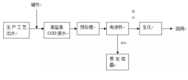 使用電滲析可以使鹽分下降至可生化標準,淡水進入生化。電滲析產出的含鹽污水經過電滲析濃縮至12%-15%以上,進入蒸發或MVR系統,最終達到零排放的目的,既為企業解決了高鹽廢水排放難題,又可以使水資源得到回收利用,節約了資源,提高了企業的經濟效益。(來源:谷騰環保網)