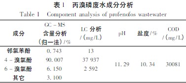 丙溴磷(profenofos) 是20 世紀(jì)70 年代后期由汽巴-嘉基公司開發(fā)的農(nóng)藥品種,對(duì)抗性害蟲表現(xiàn)出高活性,特別對(duì)抗性棉鈴蟲效果突出。該品種于2005 年被國家列入替代高毒有機(jī)磷農(nóng)藥品種之一,具有良好的發(fā)展前景。目前國內(nèi)有十余家企業(yè)生產(chǎn),每生產(chǎn)1 t 產(chǎn)品約產(chǎn)生6~7 t 廢水,該廢水由于色重、味臭、毒性大無法直接生化,必須先經(jīng)過預(yù)處理,否則無法達(dá)標(biāo)排放。近年來,國內(nèi)對(duì)該廢水的處理雖有所報(bào)道,但著重點(diǎn)在于如何從溴化工段廢水中回收溴素,且溴素回收目前已成為工業(yè)生產(chǎn)必不可少的工段,因此車間所排廢水幾乎不含溴,而文獻(xiàn)對(duì)混合廢水的主要污染成分酚的處理卻未見報(bào)道。通過對(duì)某生產(chǎn)企業(yè)提供的丙溴磷混合廢水進(jìn)行分析(見表1),發(fā)現(xiàn)其主要成分為4-溴-2-氯苯酚(簡稱4-溴氯酚),該成分為丙溴磷生產(chǎn)中的原料,因此找到從廢水中回收4-溴氯酚的合適方法就成為治理廢水污染、降低生產(chǎn)成本的關(guān)鍵。