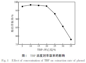 常用的絡(luò)合萃取劑有三辛胺、N,N'-二甲基庚基乙酰胺及磷酸三丁酯(TBP),其中三辛胺只能在強(qiáng)酸性條件下才能達(dá)到較好的萃取脫酚效果; N,N'-二甲基庚基乙酰胺易產(chǎn)生乳化現(xiàn)象,綜合考慮,選擇磷酸三丁酯作萃取劑。