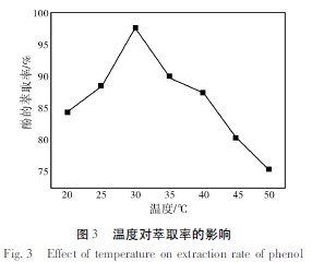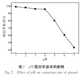 由圖2 可知,廢水的酸性越強(qiáng)萃取效果越好。pH 值在1 ~4 時(shí)酚的萃取率能達(dá)到95% 以上。當(dāng)pH 值大于4 時(shí),酚的萃取率迅速下降,這是因?yàn)楫?dāng)pH 值較高時(shí)酚類主要以易溶于水的酚鹽的形式存在,故使絡(luò)合萃取效率顯著降低。結(jié)合成本考慮,選取pH=3~4 進(jìn)行萃取。具體聯(lián)系污水寶或參見http://www.dongaorq.cn更多相關(guān)技術(shù)文檔。