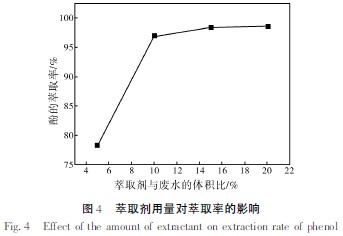 在pH=3~4、溫度30 ℃、萃取劑5%TBP-環(huán)己烷的條件下,攪拌30 min,考察萃取劑用量對(duì)萃取率的影響,分別采用廢水體積的5%、10%、15%、20% 的量加入萃取劑進(jìn)行萃取(見圖4)。