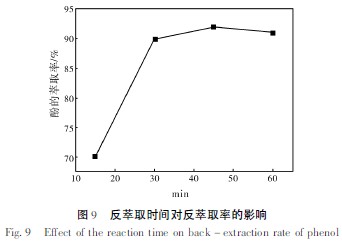 于50 ℃在有機(jī)相中加入等體積的10%NaOH 溶液,分別攪拌15、30、45、60 min,其結(jié)果見圖9。由圖9 可知,攪拌30 min 后再延長時(shí)間反萃取率變化不大,因此,攪拌時(shí)間以30 min 為宜。
