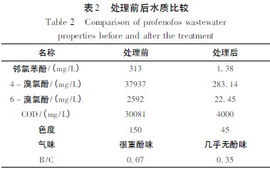 (4) 經(jīng)以上方法處理丙溴磷廢水,COD 由30081 mg/L 降低到4000 mg/L,可生化性由0. 07 提高到0. 35。