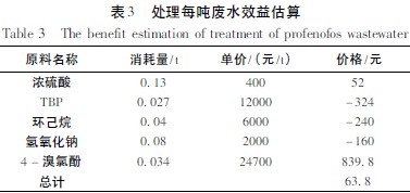 研究結(jié)果表明,采用絡(luò)合萃取法處理丙溴磷廢水,處理前后水質(zhì)變化明顯,在處理過程中雖產(chǎn)生了一定的鹽,但可生化性仍大為提高,符合進(jìn)一步生化的要求(見表2)。據(jù)此方法處理每噸廢水,通過回收4-溴氯酚,不但能減少污染,還能創(chuàng)造一定的經(jīng)濟(jì)效益(見表3)。