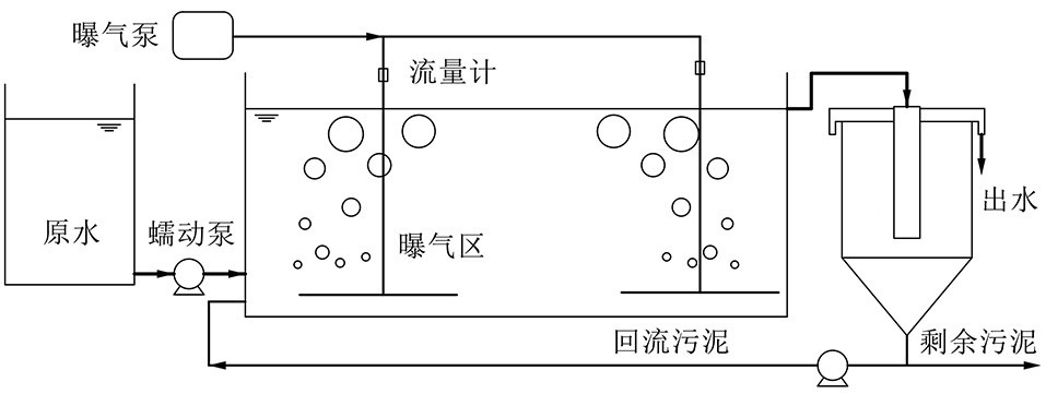 反應(yīng)器以有機玻璃為材料,有效體積為 40 L,具體尺寸為 0.8 m×0.2 m×0.35 m,有效水深為 250mm。反應(yīng)器內(nèi)設(shè)有潛水泵進行泥水混合。混合液從曝氣池溢流至沉淀池固液分離。系統(tǒng)采用蠕動泵完成連續(xù)進水和污泥回流,并利用流量計實現(xiàn)曝氣量流速控制。通過底部曝氣管的合理設(shè)置,在反應(yīng)器沿程呈現(xiàn)厭氧 - 缺氧 - 好氧的空間分布。同時利用工藝有效的內(nèi)循環(huán),使反應(yīng)器作為好氧厭氧一體化工藝運行。