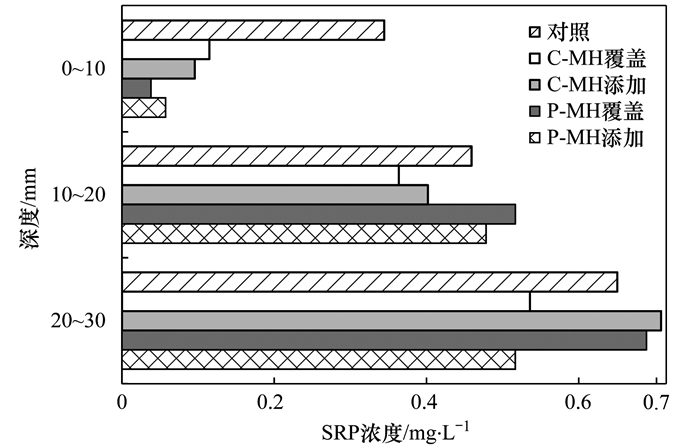 從圖 7中還可見, C-MH覆蓋、C-MH添加、P-MH覆蓋和P-MH添加作用下0~10 mm深度處底泥間隙水中SRP濃度明顯低于對照組, 它們對SRP的削減率分別為66.7%、72.2%、88.9%和83.3%, 而它們對10~20和20~30 mm深度處底泥間隙水中SRP濃度的改變程度則遠遠不如對0~10 mm深度處底泥間隙水中SRP的改變程度.由此可見, C-MH和P-MH覆蓋/添加主要是改變了0~10 mm深度處底泥間隙水中的SRP濃度, 導致該處的間隙水SRP濃度顯著降低.這說明氫氧化鎂覆蓋和添加均可以有效地控制底泥中磷向最上層底泥間隙水中的釋放.從圖 7中還可知, P-MH覆蓋對0~10 mm深度處底泥間隙水中SRP的削減率要高于C-MH覆蓋, P-MH添加的削減率也要高于C-MH添加.這說明, 人工合成的氫氧化鎂覆蓋/添加對最上層底泥中磷向間隙水中釋放的控制效率要優于商業購買的氫氧化鎂.從圖 2和圖 3可知, 氫氧化鎂對水中的磷酸鹽具有良好的吸附性能.將氫氧化鎂覆蓋到底泥-水界面上方或添加進表層底泥中后, 其會吸附最上層底泥間隙水中的SRP, 從而導致SRP濃度的下降, 而間隙水中SRP濃度的下降會降低上覆水與間隙水之間的SRP濃度差, 進而降低底泥-水界面的磷擴散速率, 從而導致進入上覆水中磷數量的下降, 最終導致上覆水中磷濃度的下降.因此, 氫氧化鎂覆蓋和添加對最上層底泥間隙水中SRP的削減作用, 是其覆蓋和添加控制底泥中磷向上覆水體中釋放的重要原因.