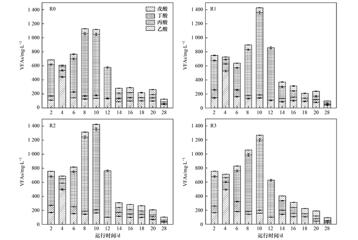 VFAs是厭氧消化過程主要中間代謝產物, 其產生與消耗速率可以用來評價厭氧消化效率[15];圖 2為實驗期間各組反應器內VFAs(包括乙酸、丙酸、丁酸和戊酸)的變化情況.