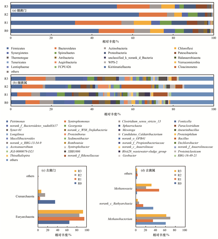在細菌門水平分布中, 主要有Firmicutes、Bacteroidetes、Actinobacteria和Chloroflexi等優勢菌, 其中Firmicutes門占絕對優勢地位, 在4個樣品中的豐度均超過31%[圖 7(a)].加入GAC和MnO2, 這些細菌始終保持優勢地位, 但是其相對豐度有所改變.進一步地分析細菌的屬水平[圖 7(b)], R0的優勢菌主要有Petrimonas(7.18%)和Syntrophomonas(7.03%), R2和R3的優勢菌有所改變, Bacillus和Syntrophomonas是R2的優勢菌, 相對豐度分別為14.69%和10.09%, R3的優勢菌為Fonticella(13.67%)和Syntrophomonas(9.76%).Petrimonas是中溫發酵微生物, 能夠將復雜的有機物轉化為乙酸[26].Syntrophomonas是利用丁酸的典型產氫產乙酸細菌, 可以將丁酸轉化為乙酸, 為嗜乙酸產甲烷菌提供代謝底物.實驗中丁酸的大量產生可能是刺激Syntrophomonas富集的原因之一, 同時Syntrophomonas的富集會促進乙酸的積累和嗜乙酸產甲烷菌Methanosaeta的生長.電活性微生物Geobacter在R0中的相對豐度僅為0.13%, 加入GAC和MnO2后, R1、R2和R3的相對豐度均有所增加.