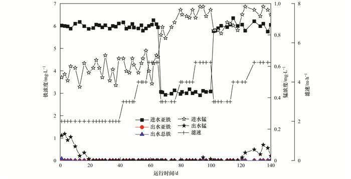 圖 2為運行過程中鐵錳濃度變化情況.由于亞鐵在濾柱中主要是通過化學(xué)接觸氧化作用去除的, 所以濾柱在啟動初期就表現(xiàn)出良好的除鐵性能, 在整個過程中濾柱的除鐵性能并未受濾速及濃度的影響, 出水總鐵均能滿足《生活飲用水衛(wèi)生標準》(GB 5749-2006)中的限值要求.而錳在濾柱中主要是通過生物作用去除的, 且有研究表明, 濾柱短期停運對于生物濾層除錳效果的影響是輕微的, 正如圖 2所示在濾柱啟動初期出水錳濃度不達標, 此后僅經(jīng)過10 d的培養(yǎng), 出水錳濃度便逐漸降低至0.09 mg·L-1, 此后出水錳濃度均能滿足標準中的限值要求, 生物除錳啟動成功