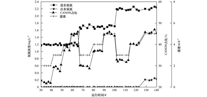 當(dāng)生物濾柱運行至70 d時, 進水氨氮濃度為1.73 mg·L-1, 濾速為3 m·h-1, 出水氨氮濃度為0, 進出水亞氮濃度均為0, 進水硝氮濃度為0.26 mg·L-1, 出水硝氮濃度為1.53 mg·L-1, 故氨氮的去除量為1.73 mg·L-1, 硝氮變化量為1.27 mg·L-1, 氮素損失為0.46 mg·L-1, 由式(9)和(10)知, 經(jīng)CANON過程去除的氨氮約為0.52 mg·L-1, 約占氨氮去除量的29.88%, 經(jīng)硝化作用去除的氨氮約為1.21 mg·L-1, 約占氨氮去除量的70.12%.由圖 6可知, 當(dāng)進水氨氮濃度平均為1.7 mg·L-1, 并以3 m·h-1的濾速運行時, 氨氮的平均去除量為1.7 mg·L-1, 經(jīng)CANON過程去除的氨氮平均約占氨氮去除量的29.73%, 約為0.50 mg·L-1, 故經(jīng)硝化作用去除的氨氮平均約占氨氮去除量的70.27%, 約為1.20 mg·L-1; 當(dāng)濾速提升至4 m·h-1時, 氨氮的平均去除量為1.7 mg·L-1, CANON作用去除的氨氮平均約占氨氮去除量的35.99%, 約為0.61 mg·L-1, 故經(jīng)硝化作用去除的氨氮平均約占氨氮去除量的64.01%, 約為1.09 mg·L-1; 繼續(xù)提升濾速至5 m·h-1, 氨氮的平均去除量仍為1.7 mg·L-1, 經(jīng)CANON作用去除的氨氮平均約占氨氮去除量的44.89%, 約為0.76 mg·L-1, 故經(jīng)硝化作用去除的氨氮平均約占氨氮去除量的55.11%, 約為0.94 mg·L-1.由此知, 當(dāng)進水氨氮濃度平均為1.7 mg·L-1時, 提升濾速會導(dǎo)致通過CANON作用去除的氨氮及比例增加, 而通過硝化作用去除的氨氮及比例降低.