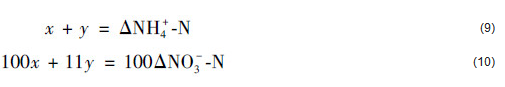 設(shè)硝化作用和CANON作用去除的氨氮分別為x和y, 則可得式(9)及式(10):