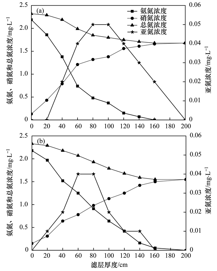 圖 8(a)為57 d時的沿程“三氮”變化, 圖 8(b)為80 d時的沿程“三氮”變化.由表 1成熟濾料吸附實驗知, 27 d時濾料已經(jīng)吸附飽和, 可以忽略其對氨氮轉(zhuǎn)化去除的影響, 生物濾柱中總氮損失僅是由于CANON過程造成的.由圖 8(a)可知, 57 d時進水氨氮、亞氮和硝氮的濃度分別為1.21、0和0.21 mg·L-1, 進水總氮濃度為1.42 mg·L-1; 出水氨氮、亞氮和硝氮的濃度分別為0、0和1.02 mg·L-1, 出水總氮濃度為1.02 mg·L-1, 由此可知, 氮素損失為0.4 mg·L-1, 由式(9)和(10)可知, 經(jīng)CANON過程去除的氨氮約為0.45 mg·L-1, 出水DO濃度約為2.88 mg·L-1.由圖 8(b)可知, 80 d時進水氨氮、亞氮和硝氮的濃度分別為1.69、0和0.13 mg·L-1, 進水總氮濃度為2.33 mg·L-1; 出水氨氮、亞氮和硝氮的濃度分別為0、0和1.27 mg·L-1, 出水總氮濃度為1.27 mg·L-1, 故氮素損失為0.55 mg·L-1, 同樣由式(9)和(10)可知, 經(jīng)CANON過程去除的氨氮約為0.62 mg·L-1, 此時出水DO濃度約為1.51 mg·L-1較57 d時有明顯降低, 而通過CANON作用去除的氨氮明顯增加.為明晰氨氮通過CANON作用去除量增加的原因, 筆者仍將以57 d和80 d時為例進行分析.