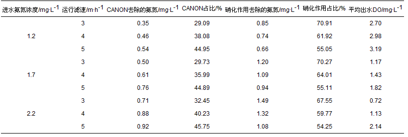 在該生物濾柱中當(dāng)進水氨氮濃度平均分別為1.2 mg·L-1和1.7 mg·L-1時, 平均進水DO濃度約為8.3 mg·L-1, 當(dāng)進水氨氮濃度平均為2.2 mg·L-1時, 平均進水DO濃度調(diào)整為約10.0 mg·L-1.由表 2及圖 6分析知, 當(dāng)濾柱均以3 m·h-1運行, 平均進水氨氮濃度為1.2 mg·L-1時, 平均的去除氨氮量為1.2 mg·L-1, 平均出水DO濃度約為2.70 mg·L-1, 經(jīng)CANON過程去除的氨氮約為0.35 mg·L-1, 約占氨氮去除量的29.09%, 經(jīng)硝化作用去除的氨氮約為0.85 mg·L-1, 約占氨氮去除量的70.91%;當(dāng)平均進水氨氮濃度為1.7 mg·L-1時, 平均的氨氮去除量為1.7 mg·L-1, 平均出水DO濃度約為1.17 mg·L-1, CANON作用去除的氨氮約為0.5 mg·L-1, 約占氨氮去除量的29.73%, 硝化作用去除的氨氮約為1.20 mg·L-1, 約占氨氮去除量的70.27%;當(dāng)平均進水氨氮濃度為2.2 mg·L-1, 此時平均的氨氮去除量為2.2 mg·L-1, 平均出水DO濃度約為0.72 mg·L-1, 經(jīng)CANON過程去除的氨氮約為0.71 mg·L-1, 約占氨氮去除量的32.45%, 經(jīng)硝化作用去除的氨氮約為1.49 mg·L-1, 約占氨氮去除量的67.55%.當(dāng)濾柱均以4 m·h-1運行, 進水氨氮濃度平均為1.2 mg·L-1時, 氨氮的平均去除量為1.2 mg·L-1, 平均出水DO濃度約為2.98 mg·L-1, 經(jīng)CANON過程去除的氨氮約為0.46 mg·L-1, 約占氨氮去除量的38.08%, 經(jīng)硝化作用去除的氨氮約為0.74 mg·L-1, 約占氨氮去除量的61.92%;當(dāng)進水氨氮濃度平均為1.7 mg·L-1時, 氨氮的平均去除量為1.7 mg·L-1, 平均出水DO濃度約為1.43 mg·L-1, 經(jīng)CANON過程去除的氨氮約為0.61 mg·L-1, 約占氨氮去除量的35.99%, 經(jīng)硝化作用去除的氨氮約為1.09 mg·L-1, 約占氨氮去除量的64.01%;當(dāng)進水氨氮濃度平均為2.2 mg·L-1時, 氨氮的平均去除量為2.2 mg·L-1, 平均出水DO濃度約為1.13 mg·L-1, 經(jīng)CANON過程去除的氨氮約為0.88 mg·L-1, 約占氨氮去除量的40.23%, 經(jīng)硝化作用去除的氨氮約為1.32 mg·L-1, 約占氨氮去除量的59.77%.當(dāng)濾柱均以5 m·h-1運行, 進水氨氮濃度平均為1.2 mg·L-1時, 氨氮的平均去除量為1.2 mg·L-1, 平均出水DO濃度約為3.19 mg·L-1, 經(jīng)CANON過程去除的氨氮約為0.54 mg·L-1, 約占氨氮去除量的44.95%, 經(jīng)硝化作用去除的氨氮約為0.66 mg·L-1, 約占氨氮去除量的55.05%;當(dāng)平均進水氨氮濃度為1.7 mg·L-1時, 平均去除的氨氮為1.7 mg·L-1, 出水DO濃度平均約為1.82 mg·L-1, CANON過程去除的氨氮約為0.76 mg·L-1, 約占氨氮去除量的44.89%, 硝化作用去除的氨氮約為0.94 mg·L-1, 約占氨氮去除量的55.11%;當(dāng)平均進水氨氮濃度為2.2 mg·L-1時, 平均的氨氮去除量降至約2.0 mg·L-1, 平均出水DO濃度約為2.14 mg·L-1, 經(jīng)CANON過程去除的氨氮約為0.92 mg·L-1, 約占氨氮去除量的45.75%, 經(jīng)硝化作用去除的氨氮約為1.08 mg·L-1, 約占氨氮去除量的54.25%.故由上述知, 當(dāng)濾速保持不變, 適度提升進水氨氮濃度, 會導(dǎo)致通過CANON作用去除的氨氮增加.為進一步明確水質(zhì)對氨氮去除的影響, 筆者將以運行濾速均為4 m·h-1, 平均進水氨氮濃度分別為1.2和1.69 mg·L-1為例進行分析.