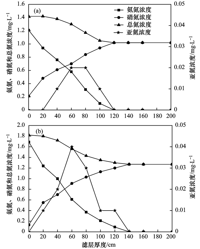 由圖 8(a)知, 當(dāng)進水氨氮濃度為1.21 mg·L-1時, 濾柱中的氨氮至濾層120 cm處降低至0, 在濾層20 cm至120 cm范圍內(nèi)的水中均有亞氮積累, 由總氮濃度沿程變化曲線知, 氮素損失主要發(fā)生在濾層的40~100 cm, 在濾層40~100 cm范圍內(nèi)共存有亞氮和氨氮, 滿足CANON工藝的條件.而由圖 8(b)知, 當(dāng)進水氨氮濃度提升至1.69 mg·L-1時, 濾柱中的氨氮需至濾層140 cm處降低至0, 對比57 d時進水氨氮濃度為1.21 mg·L-1可知, 進水氨氮濃度增加會導(dǎo)致氨氮去除區(qū)位向濾層深處位移, 此時在濾層前140 cm的水中均有亞氮積累, 同樣由總氮濃度沿程變化曲線知, 氮素損失主要發(fā)生在濾層的20~120 cm, 在濾層20~120 cm范圍內(nèi)亦共存亞氮和氨氮, 同樣滿足CANON工藝所需的條件.由上文已知, 當(dāng)進水氨氮濃度為1.21 mg·L-1時, 經(jīng)CANON過程去除的氨氮約為0.45 mg·L-1, 而當(dāng)進水氨氮濃度為1.69 mg·L-1時, 經(jīng)CANON過程去除的氨氮增加至0.62 mg·L-1.相較于前者, 后者經(jīng)CANON過程去除的氨氮增加的原因亦可以由兩者的氨氮濃度沿程變化曲線進行說明:由氨氮濃度沿程變化曲線和亞氮濃度沿程變化曲線知, 濾柱在57 d以進水氨氮濃度為1.21 mg·L-1運行時在氨氮和亞氮共存區(qū)域中的氨氮濃度要小于濾柱在80 d以進水氨氮濃度為1.69 mg·L-1運行時在氨氮和亞氮共存區(qū)域中的氨氮濃度, 故后者濾層中CANON過程第二步所處的氨氮濃度升高, 提高了濾層中AnAOB對氨氮離子的網(wǎng)捕效率, 微生物與氨氮濃度所處的動態(tài)平衡遭到破壞, 歷經(jīng)第一活性增長期, 濾層的ANAMMOX性能增強.因此保持濾速不變, 提升進水氨氮濃度會導(dǎo)致通過CANON作用去除的氨氮增加.