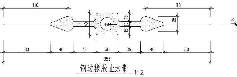為克服池體溫度應力過大而破壞整體結構這一問題,把伸縮縫設置在超長構筑物位置。其結構防水性能差,既要能夠適應溫度伸縮,還要防止結構變形。嚴禁伸縮縫位置有貫穿通道,規避滲漏問題。該工況下,把鋼邊橡膠止水帶用到伸縮縫中,嵌縫密封料采用雙組份聚硫密封膠密封。進場前,對其質量進行多次核查,合理存放,以免被鋼筋劃傷,規避漏水問題。采用正確方法,安裝橡膠止水帶,其中央圓環、沉降縫中軸線一定要重合。如圖 2 和圖 3 所示,分別為伸縮縫詳細圖和鋼邊橡膠止水帶。