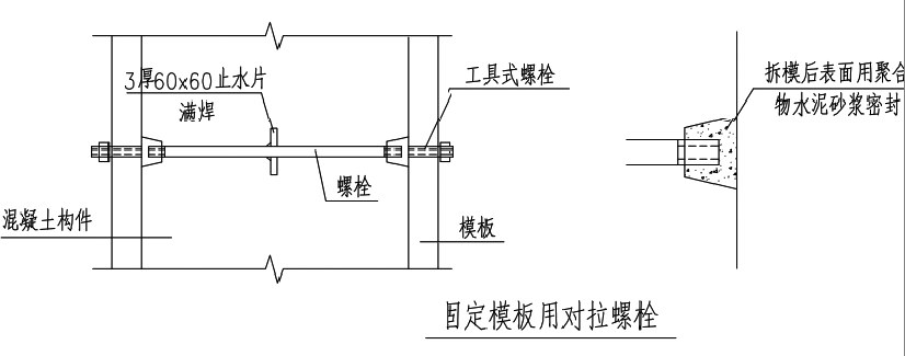 發揮工具式螺栓優勢,對模板進行固定,對拉螺栓居中加焊3 厚方形止水片,滿焊止水片和螺栓。完成拆模工作后,把螺栓截斷,并使用聚合物水泥砂漿,密封構件表層。如圖4 所示,固定模板用對拉螺栓。