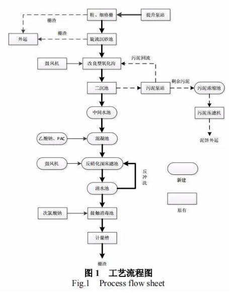 根據污水處理廠的運行狀況,污水處理廠的二沉池有浮萍等富營養化標志物出現,出水中含較多 N、P 元素;同時由于帶式脫水機的處理能力不足,一方面導致回流量增大,系統內污泥齡加大,使得污泥活性降低,脫氮除磷效果變差,另一方面導致二沉池沉淀污泥停留時間變長,產生厭氧效果,磷在厭氧條件下被釋放,使出水含磷量增高。針對污水處理廠實際運行問題,本著減少對現狀產生影響的原則,本工程的提標改造在原有粗格柵——細格柵——旋流沉砂池——改良型氧化溝——二沉池——接觸消毒的工藝流程基礎上,增加中間水池、混凝池、反硝化深床濾池、清水池、污泥濃縮池、反硝化加藥間和風機房,同時增加污泥脫水機。提標改造后具體工藝流程圖見圖: