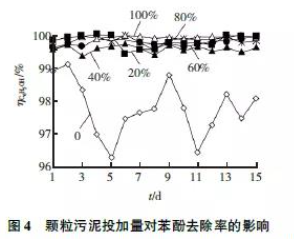 由圖4 可知,無顆粒污泥時,苯酚的去除率波動很大,去除率在96. 33%~ 99. 09%; 有顆粒污泥存在時,苯酚的去除率都在99%以上,平均為99.90%。由此可知,加入顆粒污泥可增強反應器對苯酚的去除效果,并且加入顆粒污泥的量對苯酚的去除率影響不大。苯酚是一種有毒物質,對活性污泥生長具有一定的抑制作用,而顆粒污泥中具有豐富的生物相,可以保證苯酚的去除效果。