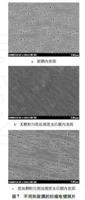 為了直觀的觀測膜污染情況,描電鏡觀察新膜內表面、無顆粒污泥與投加顆粒污泥在運行周期結束后的膜表面,見圖7。