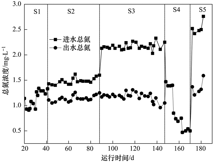 濾柱運行過程中進出水總氮如圖 3所示.從中可知, 在S1階段(20~41 d)和S4階段(148~170 d)進水總氮等于出水總氮, 濾柱中并未有氮素損失, 而S2階段(42~88 d)、S3階段(90~147 d)和S5階段(172~182 d)均有明顯的氮素損失, 進水總氮大于出水總氮, 且S2階段的氮素損失量明顯低于S3和S5階段的氮素損失量, 筆者將在下文中探究氮素損失的原因.