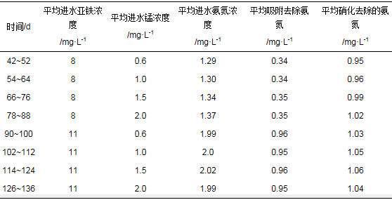 (2) 在此工藝中保持進水錳濃度不變, 調節進水亞鐵升至一定濃度時濾層中亞鐵氧化形成的氧化物會吸附氨氮, 導致氨氮通過吸附和硝化兩種作用去除, 且吸附作用先于硝化作用.