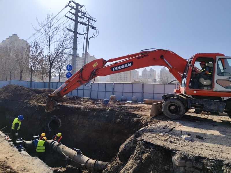 日前,昌吉市第二污水處理廠中水管線建設項目有序復工。在項目建設現場終點,工人、大型機械配合進行管道土層碾壓工作。