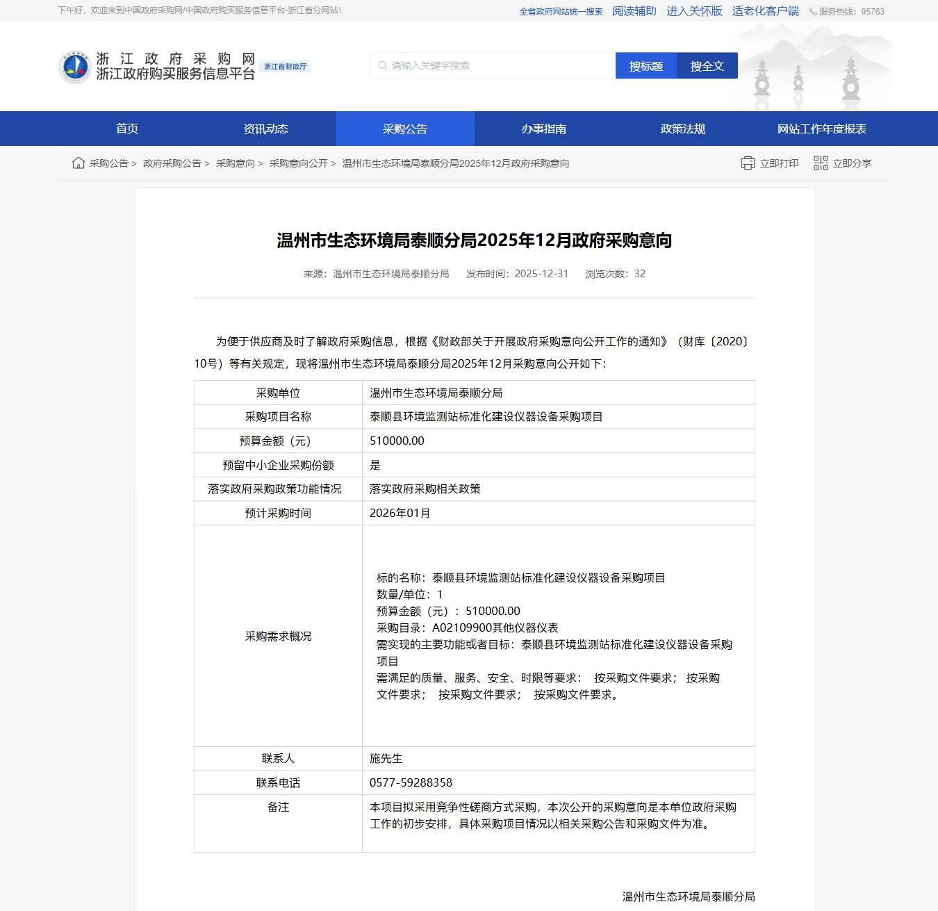 浙江溫州市生態(tài)環(huán)境局泰順分局2025年12月政府采購意向公告
