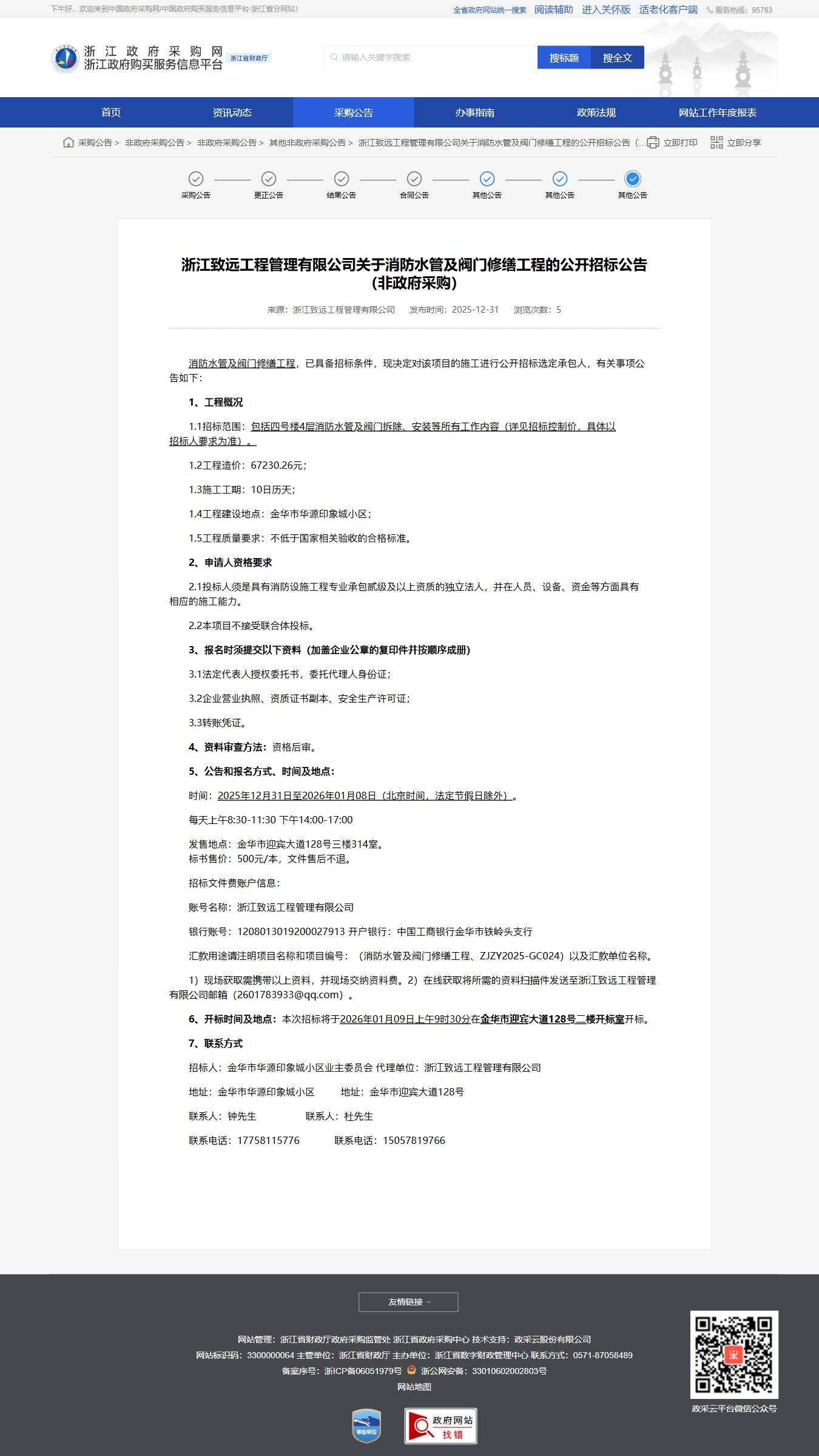 浙江關于消防水管及閥門修繕工程的公開招標公告(非政府采購)