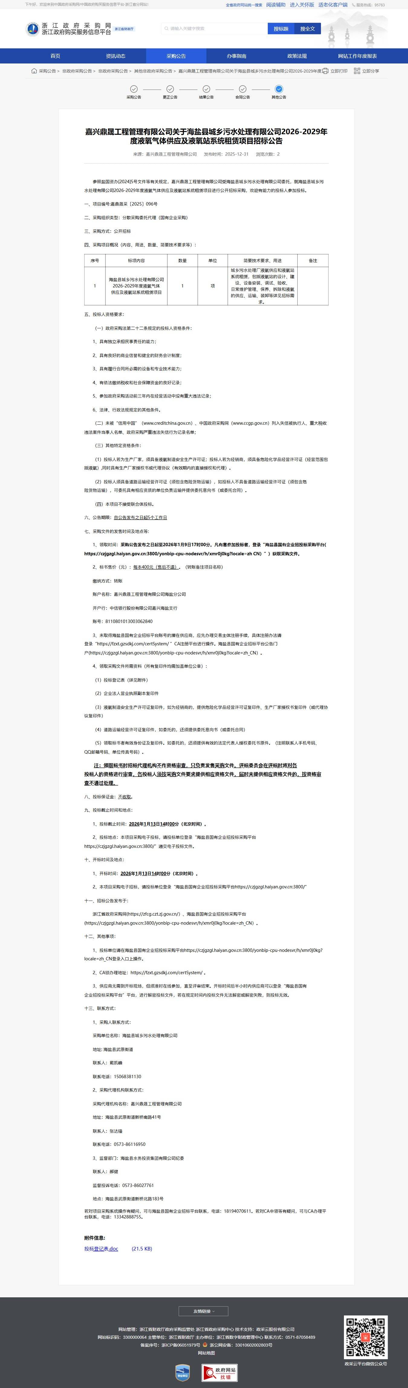 1 | 城鄉污水處理廠液氧供應和液氧站 | 海鹽縣城鄉污水處理有限公司 | 設、設備安裝、調試、驗收、日常維護管理、保養、拆除和液氧的供應、運輸、裝卸等(詳見招標文件)