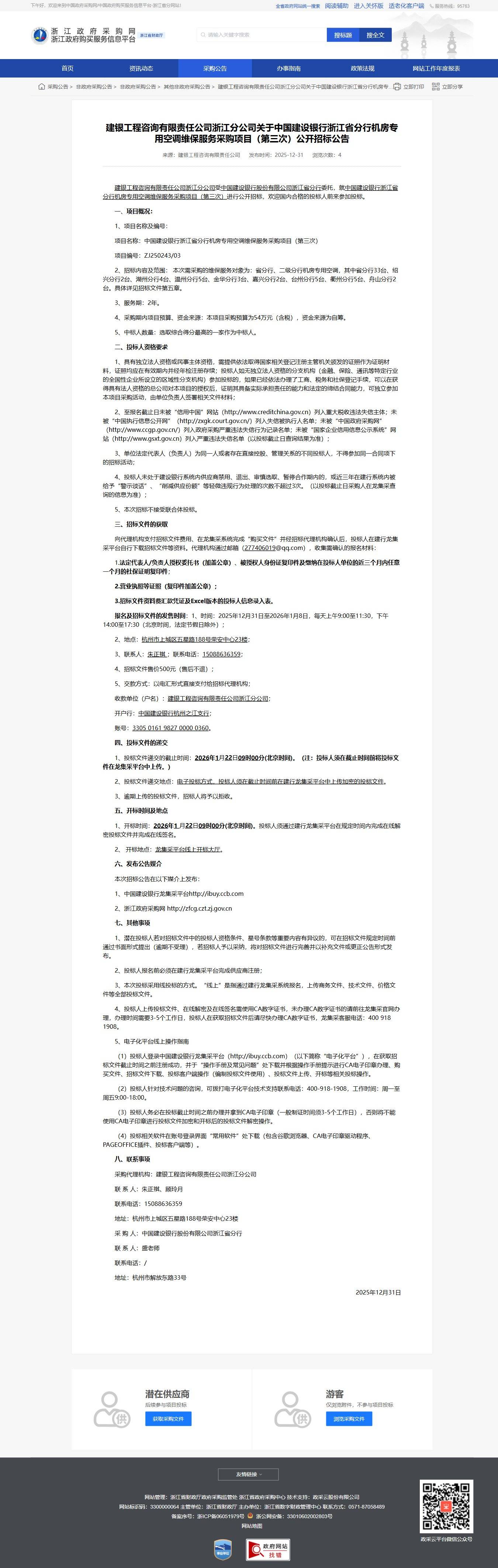 - 項目名稱: 中國建設銀行浙江省分行機房專用空調維保服務采購項目(第三次)