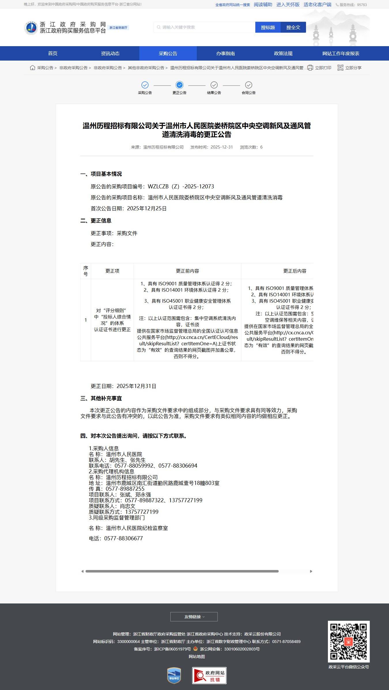 浙江關于溫州市人民醫院婁橋院區中央空調新風及通風管道清洗消毒的更正公告