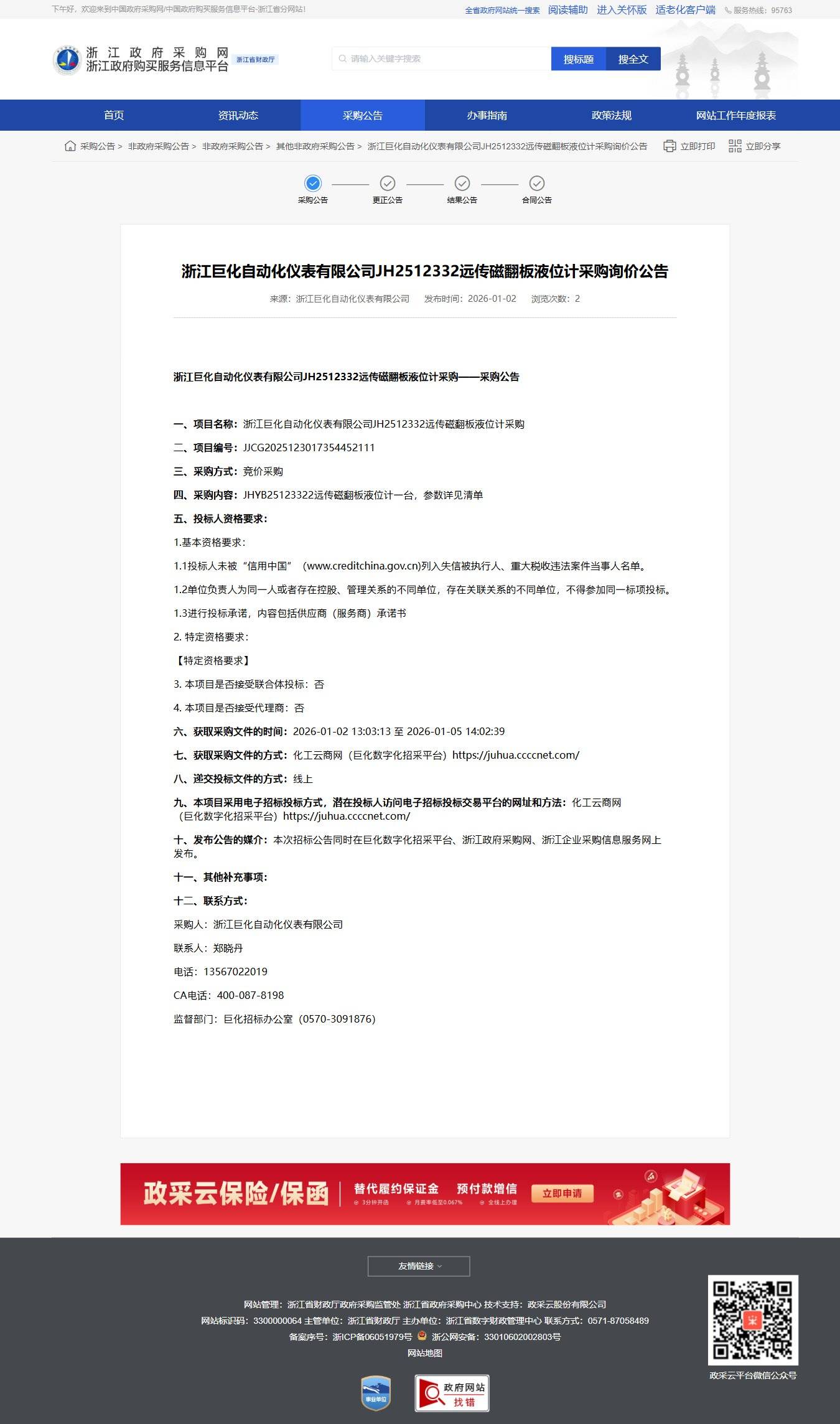 浙江巨化自動(dòng)化儀表有限公司JH2512332遠(yuǎn)傳磁翻板液位計(jì)采購詢價(jià)公告