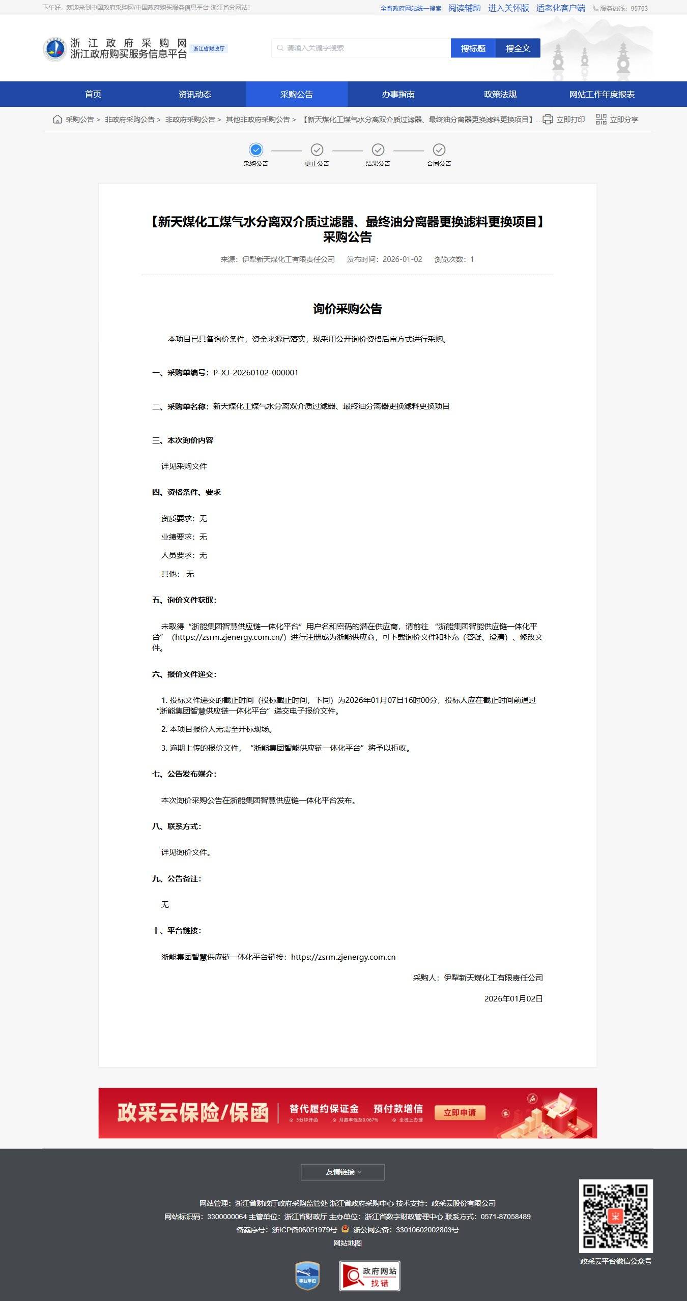 浙江新天煤化工煤氣水分離雙介質(zhì)過濾器、最終油分離器更換濾料更換項目采購公告