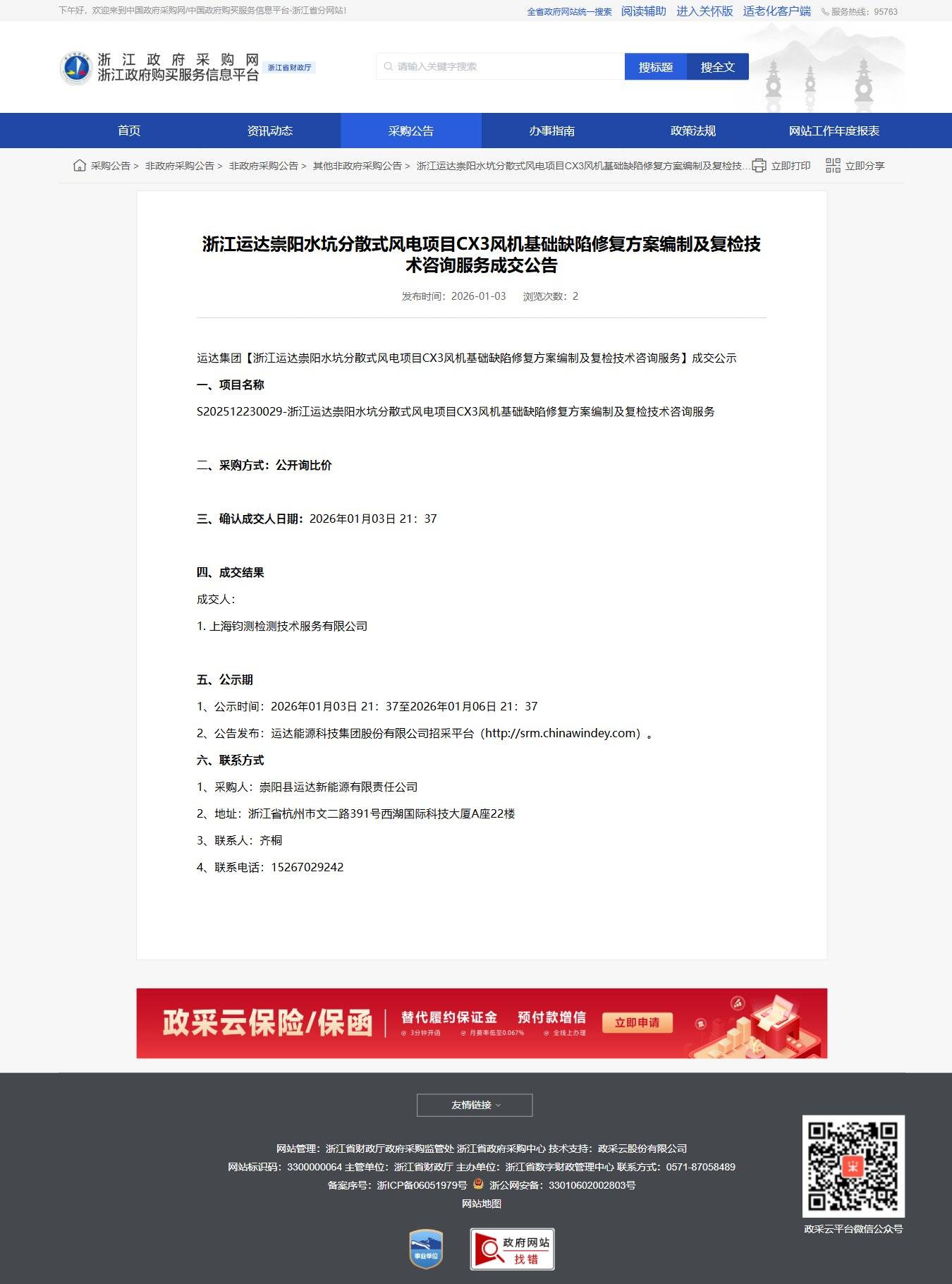 浙江運達崇陽水坑分散式風電項目CX3風機基礎缺陷修復方案編制及復檢技術咨詢服務成交公告