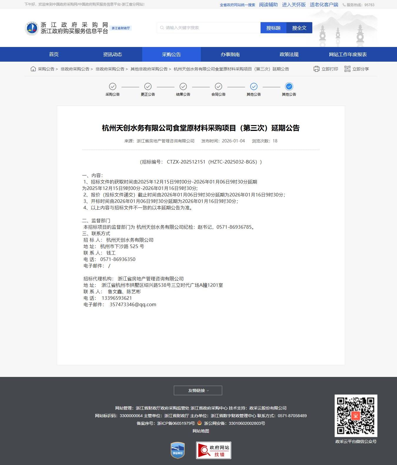 浙江杭州天創水務有限公司食堂原材料采購項目(第三次)延期公告