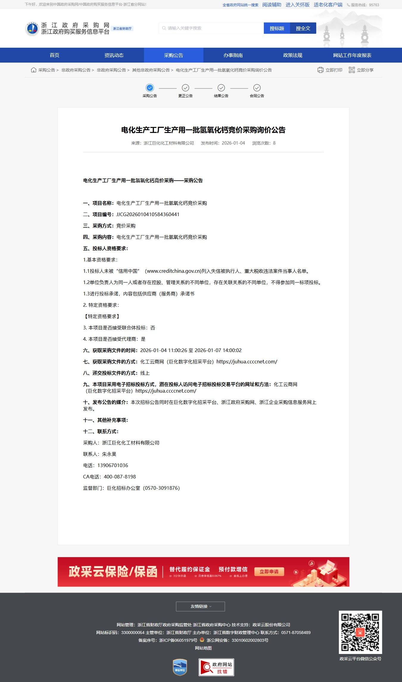 浙江電化生產工廠生產用一批氫氧化鈣競價采購詢價公告