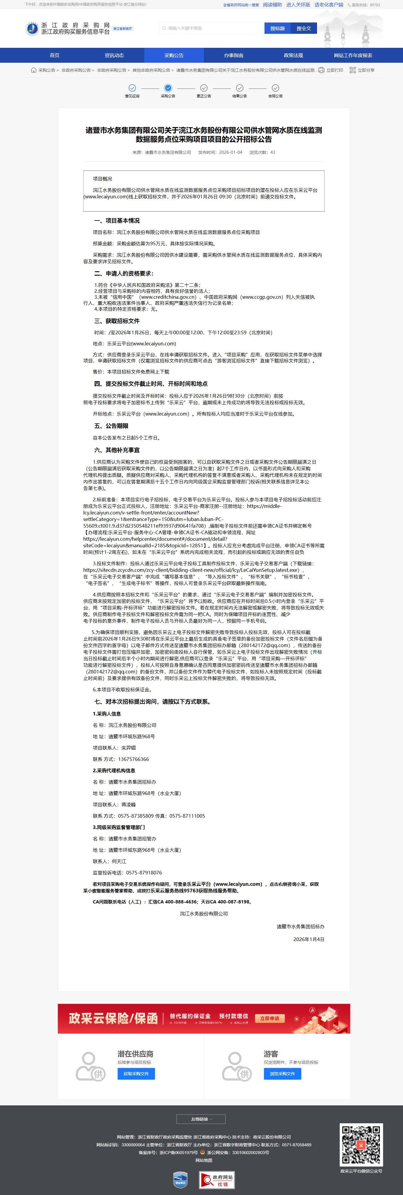 浙江關于浣江水務股份有限公司供水管網水質在線監測數據服務點位采購項目項目的公開招標公告