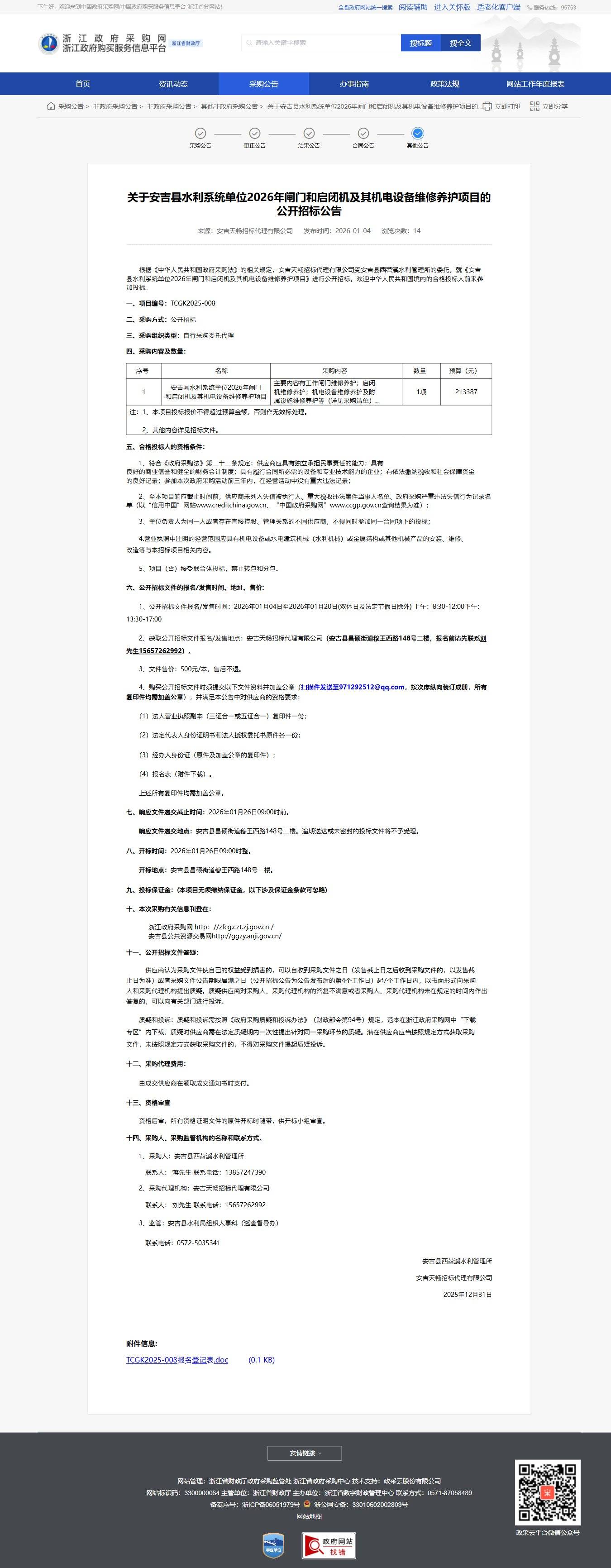浙江關(guān)于安吉縣水利系統(tǒng)單位2026年閘門和啟閉機(jī)及其機(jī)電設(shè)備維修養(yǎng)護(hù)項(xiàng)目的公開招標(biāo)公告