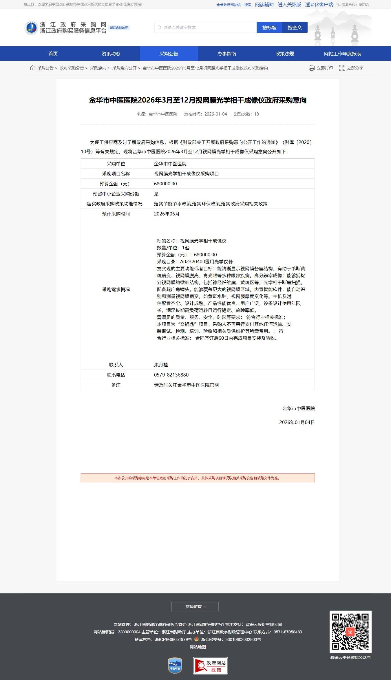 浙江金華市中醫(yī)醫(yī)院2026年3月至12月視網(wǎng)膜光學(xué)相干成像儀政府采購意向公告