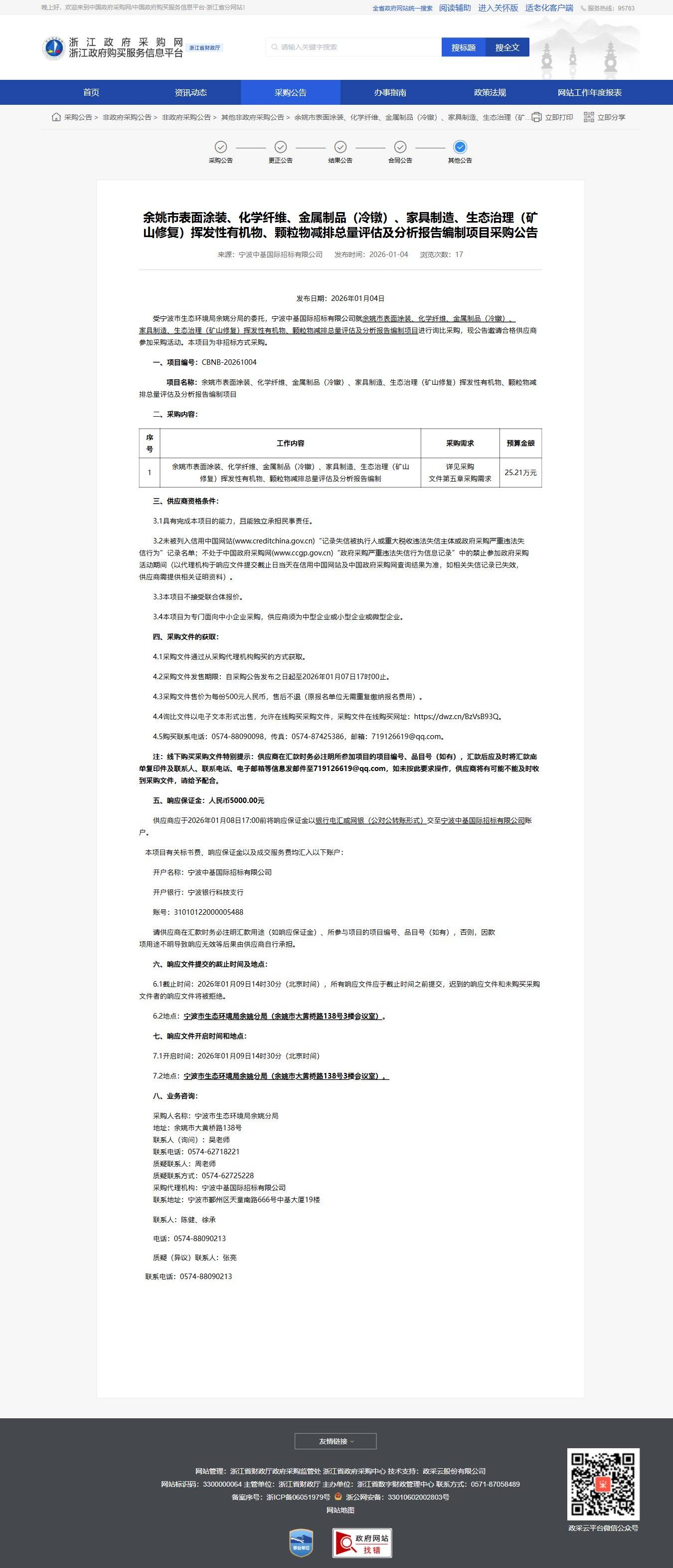 浙江余姚市表面涂裝、化學(xué)纖維、金屬制品(冷鐓)、家具制造、生態(tài)治理(礦山修復(fù))揮發(fā)性有機物、顆粒物減排總量評估及分析報告編制項目采購公告