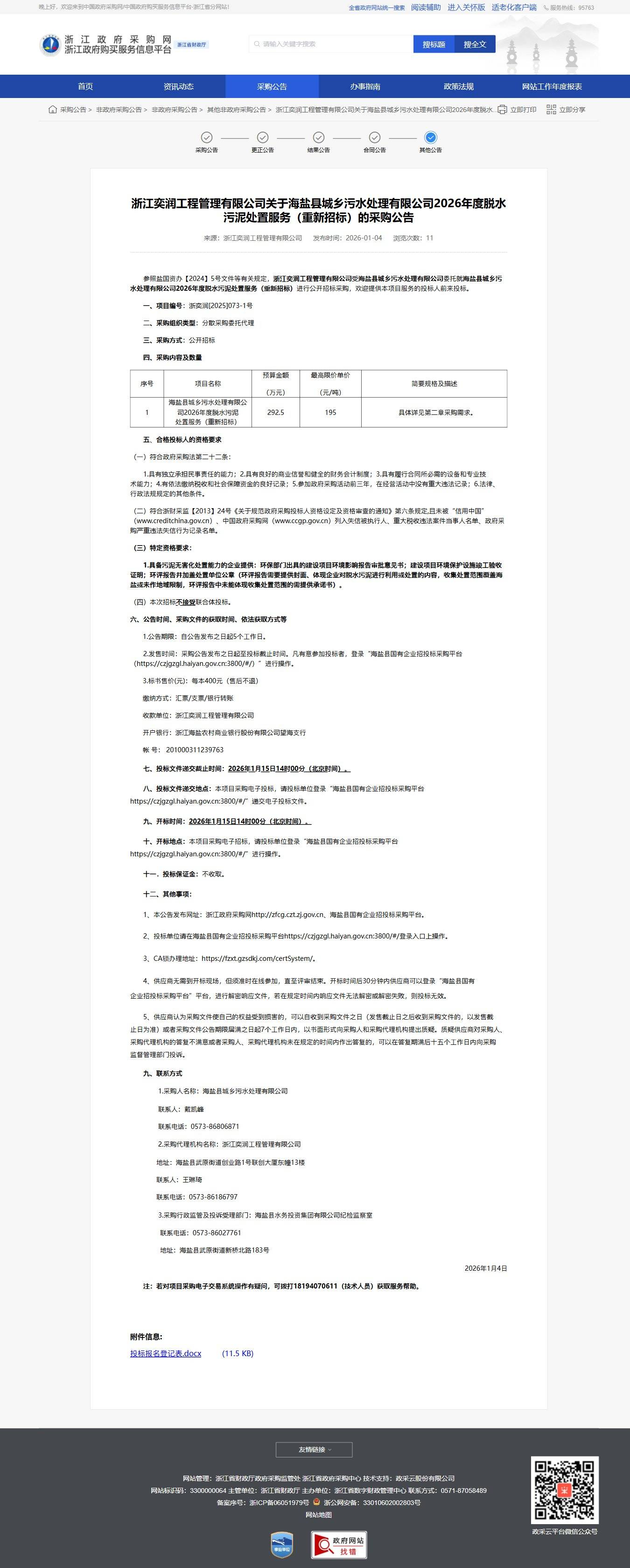 浙江奕潤工程管理有限公司關于海鹽縣城鄉(xiāng)污水處理有限公司2026年度脫水污泥處置服務(重新招標)的采購公告