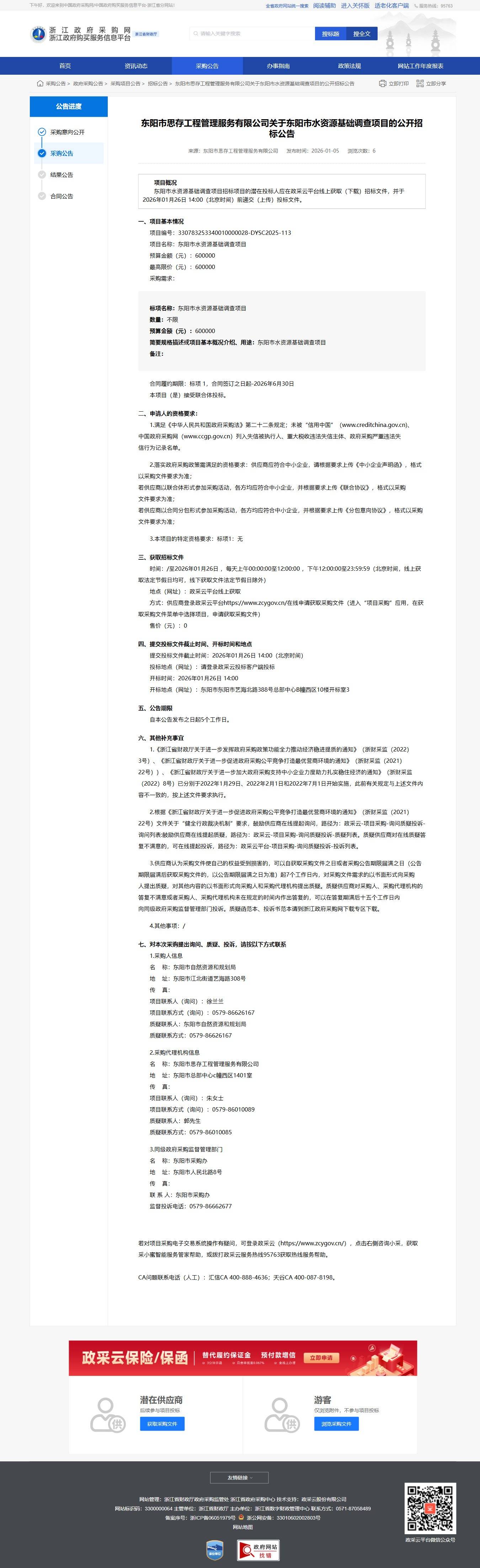東陽市水資源基礎調查項目招標項目的潛在投標人應在政采云平臺線上獲取(下載)招標文件,并于合同公告2026年01月26日14.00(北京時間)前遞交〈上傳)投標文件。