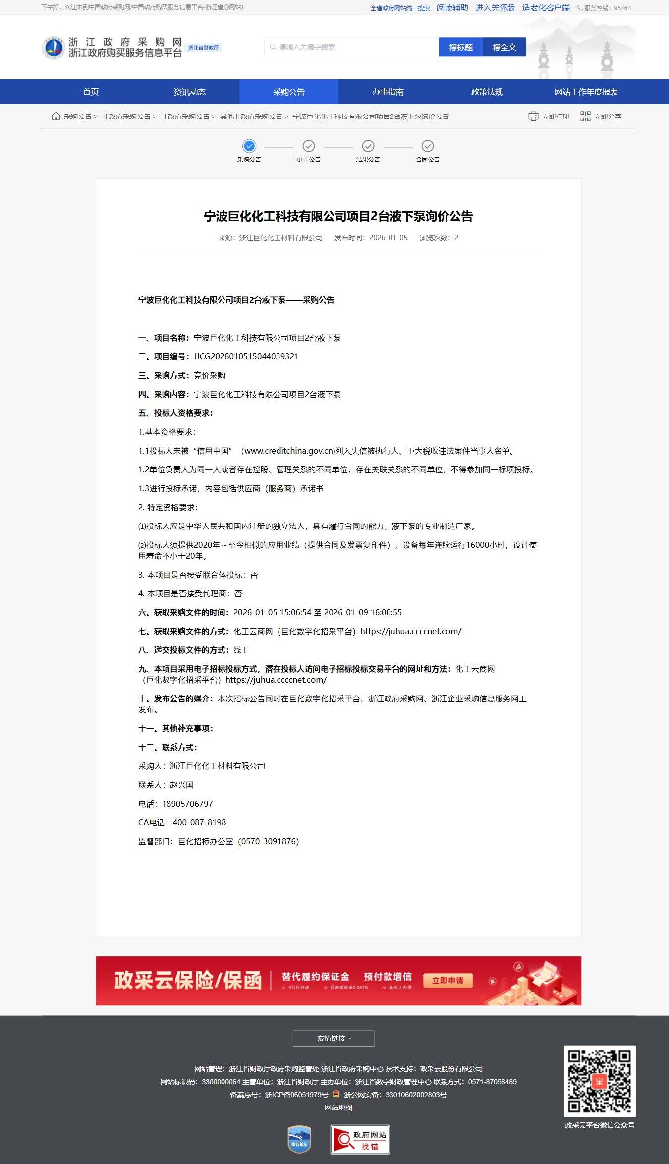 浙江寧波巨化化工科技有限公司項目2臺液下泵詢價公告
