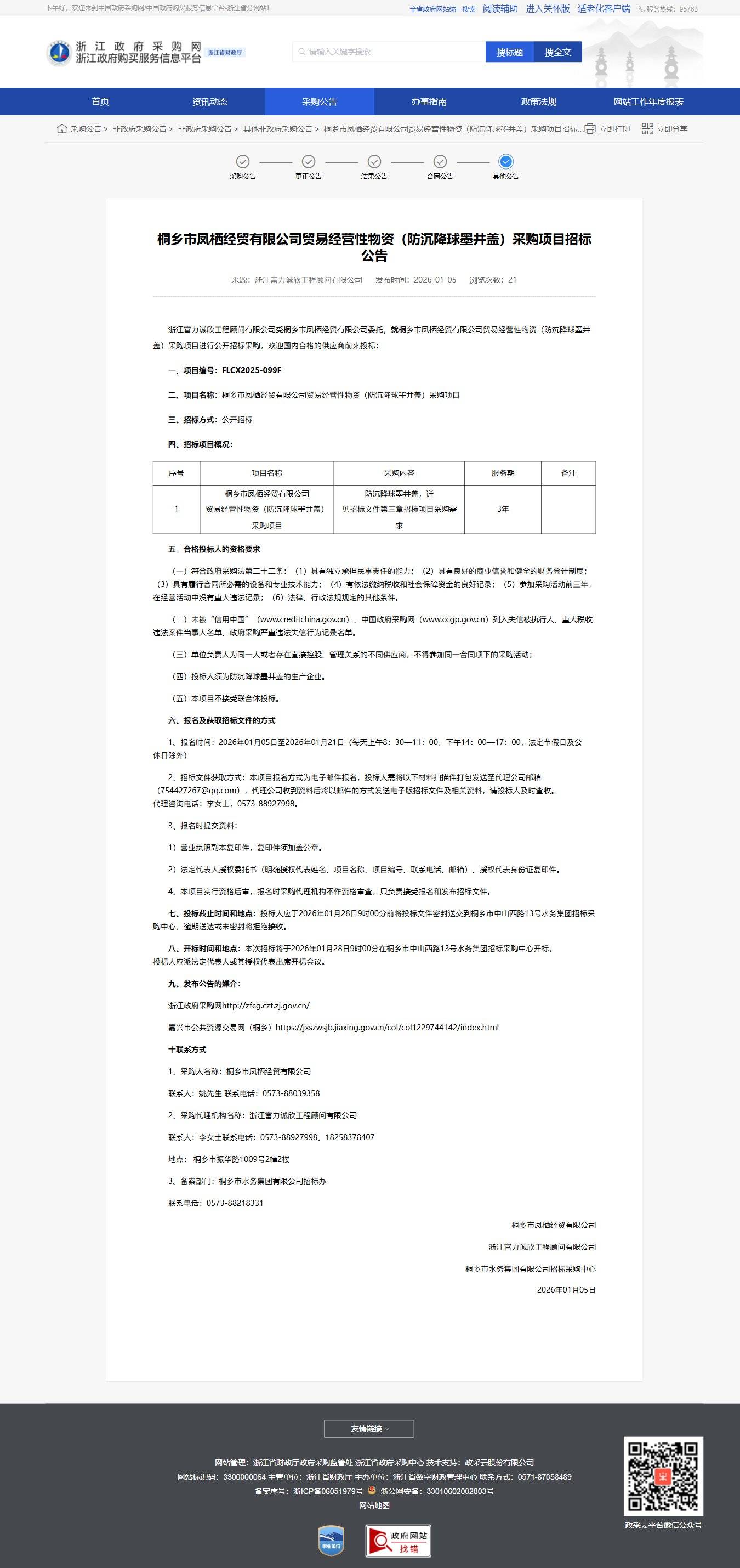 浙江桐鄉市鳳棲經貿有限公司貿易經營性物資(防沉降球墨井蓋)采購項目招標公告
