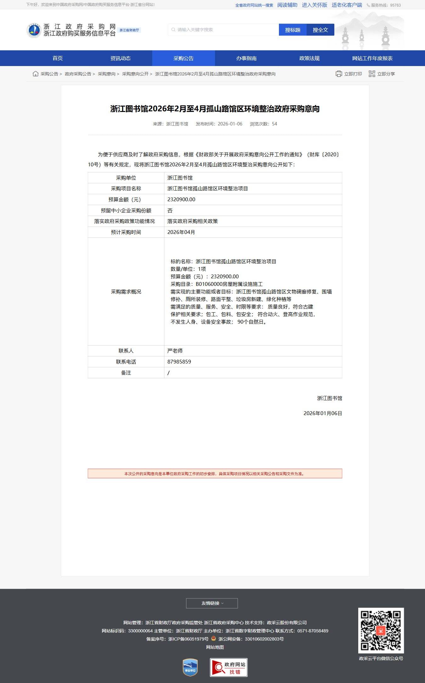 浙江圖書館2026年2月至4月孤山路館區環境整治政府采購意向公告