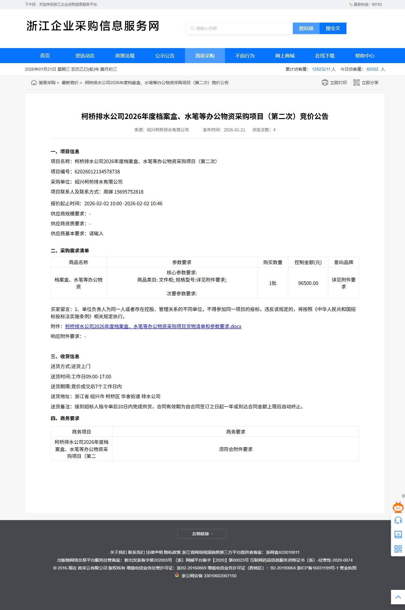 浙江柯橋排水公司2026年度檔案盒、水筆等辦公物資采購項目(第二次)競價公告