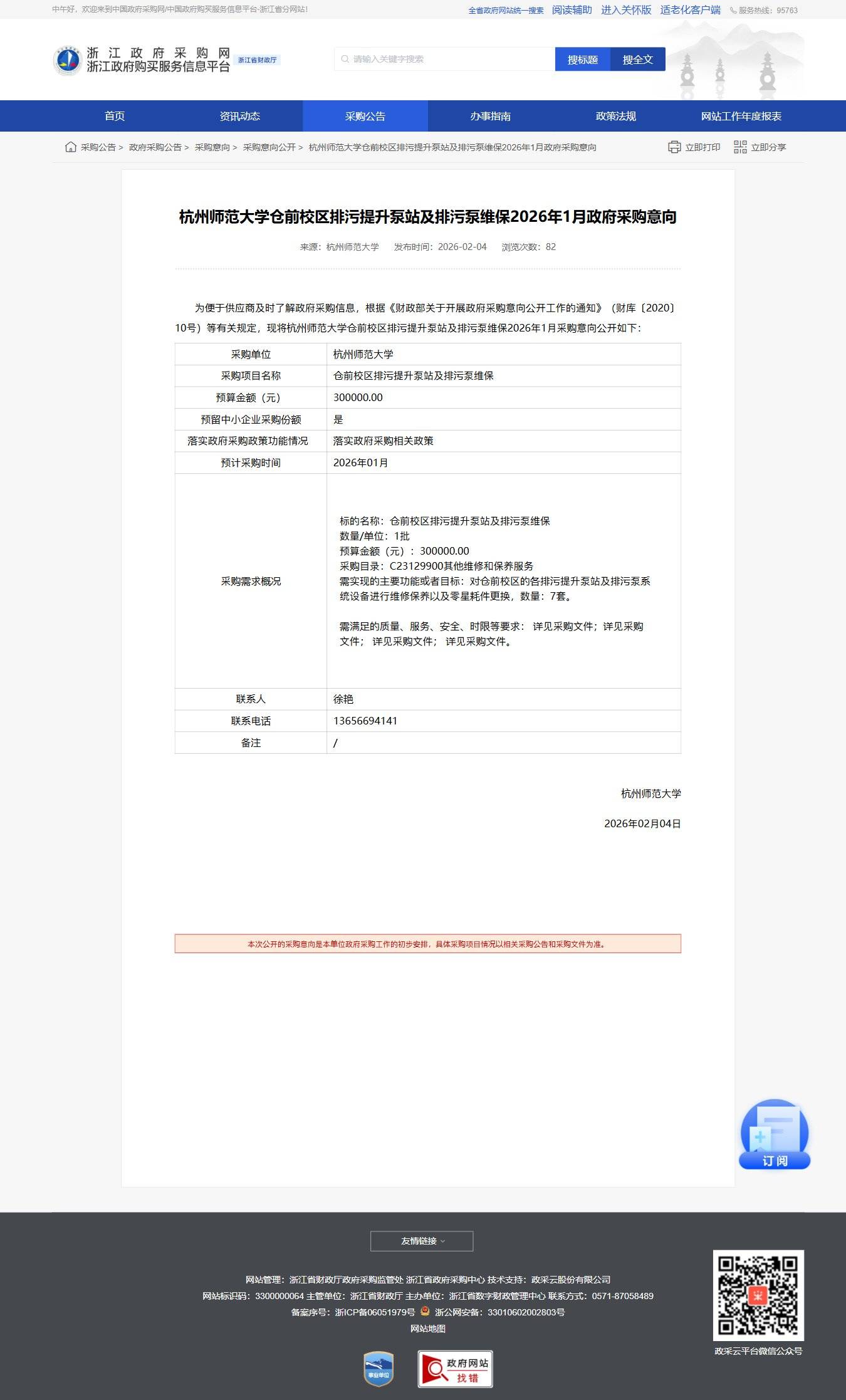 浙江杭州師范大學倉前校區排污提升泵站及排污泵維保2026年1月政府采購意向公告